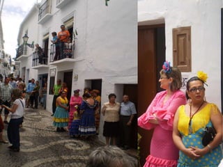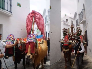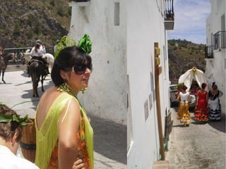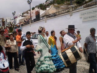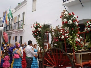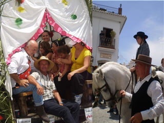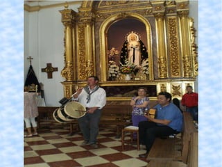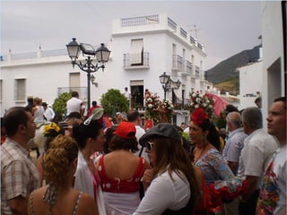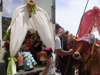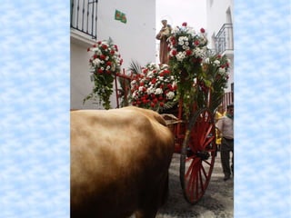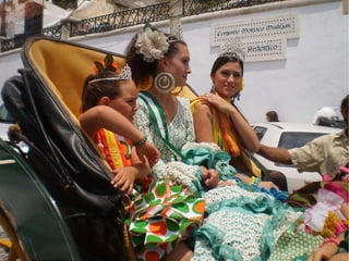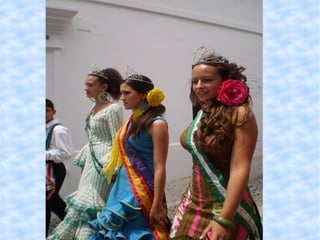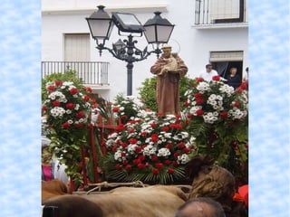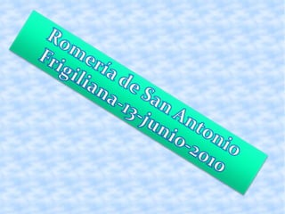 El documento describe las actividades de una misa y procesión de San Antonio en un pueblo español. Detalla los roles de los participantes como el primer y segundo caballero, la reina y las damas. Menciona que la Reina de las Fiestas de 2010 fue Angela Mena y la primera Dama de Honor fue Carmen Vinuesa. Relata la salida de San Antonio y el camino al río, nombrando a las guapas de 2010 como Angela Mena, Carmen Vinuesa y Eva Moreno. En tono humorístico comenta que a pesar de su participación no rec