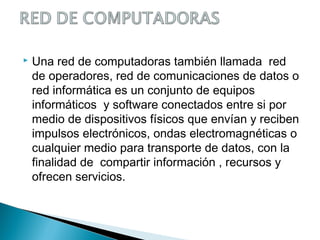 Una red de computadoras permite compartir información y recursos entre equipos conectados a través de dispositivos físicos. Internet es una red descentralizada de redes interconectadas que usa protocolos TCP/IP para funcionar como una única red mundial desde 1969. La World Wide Web utiliza protocolos sencillos para consultar archivos de hipertexto de forma remota a través de Internet.