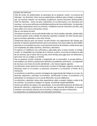 Este documento resume un libro sobre la gestión escolar escrito por Romero en 2008. La gestión escolar es un proceso complejo que implica lidiar con conflictos y múltiples actores para lograr un bien común. Un buen liderazgo, altas expectativas y una visión compartida son factores clave para el éxito de una escuela, mientras que la falta de liderazgo y bajas expectativas conducen a la ineficacia. Una buena escuela debe tener un proyecto educativo claro y brindar apoyo a los estudiantes