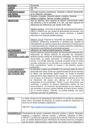 La profesora presentará nuevos conceptos sobre derecho a través de un Padlet. Los estudiantes se dividirán en grupos para investigar los conceptos asignados y explicarlos a la clase utilizando el Padlet. Luego completarán actividades en el Padlet y discutirán sus opiniones sobre las actividades al final de la clase.