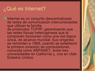 Internet es una red descentralizada de redes interconectadas que usan protocolos TCP/IP para funcionar como una sola red lógica a nivel mundial. Se originó en 1969 con la conexión entre universidades en California y Utah. Hoy en día, Internet ofrece un inmenso abanico de posibilidades que a veces puede ser excesivo, y su crecimiento ha implicado un aumento en las relaciones virtuales entre personas. Los buscadores indexan sitios web y muestran resultados relacionados con palabras clave.
