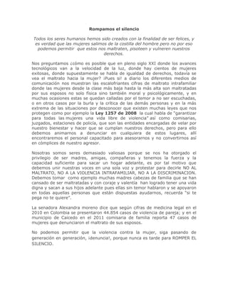El documento argumenta que a pesar de los avances en derechos de la mujer, todavía existe el maltrato hacia ellas. Insta a las mujeres a denunciar el maltrato doméstico, ya que existen leyes como la Ley 1257 de 2008 que las protegen. Finalmente, cita cifras de violencia doméstica reportadas por Medicina Legal y una comisaria de familia para enfatizar que el maltrato sigue ocurriendo y que es necesario romper el silencio.