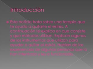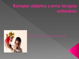 Este documento habla sobre una terapia antiestrés llamada "Crash Therapy" que permite a los clientes romper objetos como platos, vasos y pequeños electrodomésticos para aliviar el estrés. La empresa explica que esto ayuda a las personas a desahogarse y dejar sus problemas atrás. Algunos clientes comentan que la experiencia les hace sentirse más relajados y desconectados de sus preocupaciones.