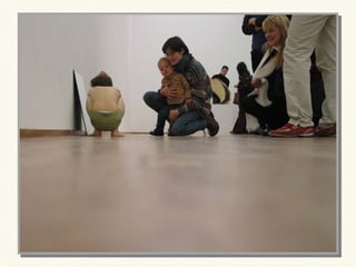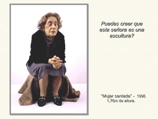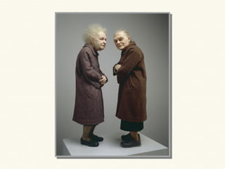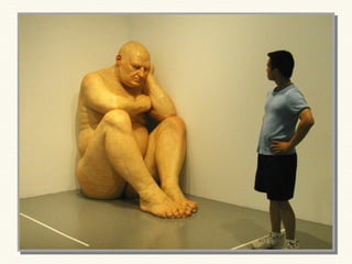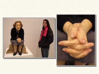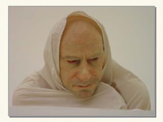 Ron Mueck es un escultor australiano especializado en crear figuras humanas hiperrealistas mediante el modelado. Se dedica principalmente a retratar personas comunes en tamaños mayores que la vida real, logrando un alto grado de detalle anatómico que genera una sensación de hiperrealismo. Algunas de sus obras más conocidas incluyen "Mujer embarazada", "Hombre grande" y "Madre e hijo".