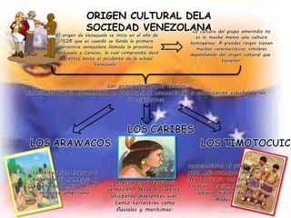 Este documento resume el origen cultural de la sociedad venezolana. Se inicia describiendo a los principales grupos indígenas que habitaban Venezuela antes de la colonización española, como los Arawacos, Caribes y Timoto-Cuicas. Luego describe cómo la cultura hispano-venezolana resultó de la mezcla de las culturas indígena, española y africana, incluyendo aspectos como viviendas, economía, religión, gastronomía, idioma y danzas. Finalmente, resalta que la cultura venezolana