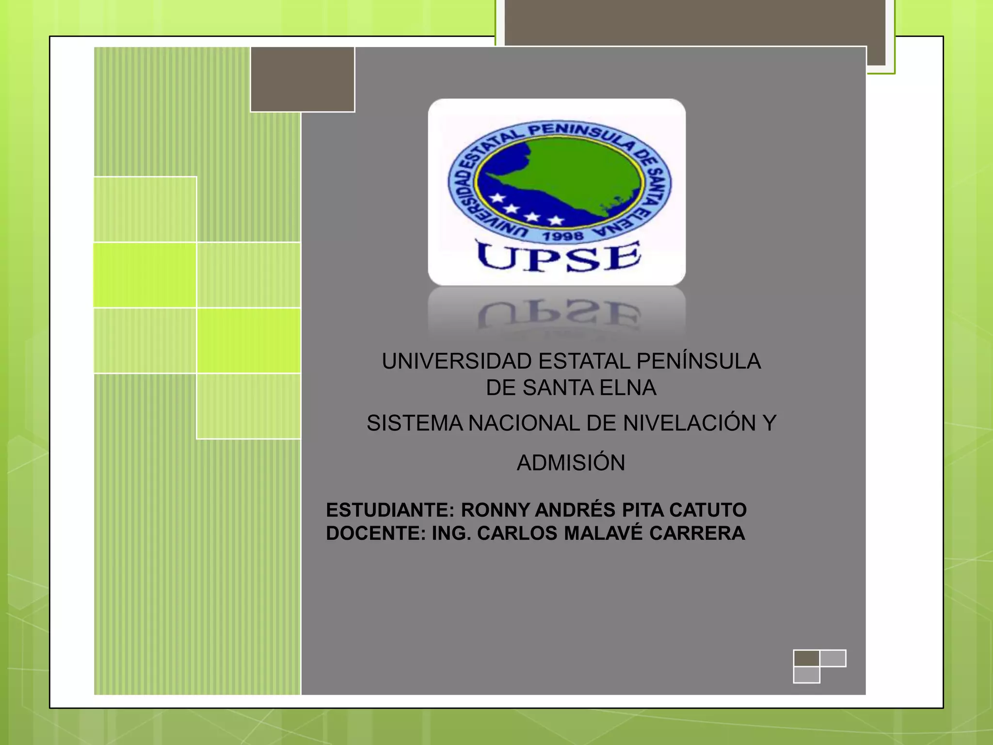 La Universidad Estatal Península de Santa Elna proporcionó un documento sobre el Sistema Nacional de Nivelación y Admisión para el estudiante Ronny Andrés Pita Catuto. El docente a cargo era el Ing. Carlos Malavé Carrera.