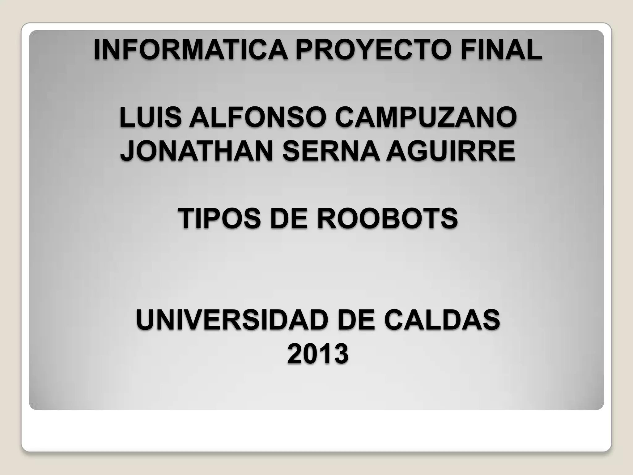 Este documento presenta un resumen sobre tipos de robots. Describe robots móviles, industriales, médicos, teleoperados y zoomórficos. También discute brevemente las ventajas e inconvenientes de los robots.