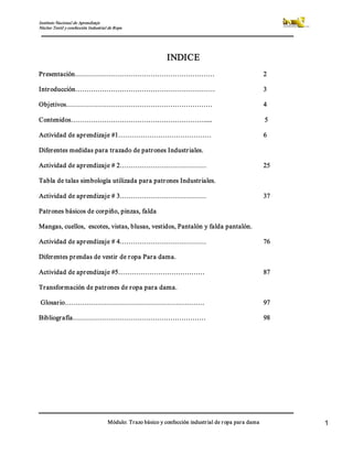 Este documento presenta información sobre el proceso de toma de medidas y trazado de patrones industriales de ropa para damas. Explica el sistema métrico decimal y las unidades de medida utilizadas. Describe los instrumentos necesarios como la cinta métrica y reglas, y los pasos para tomar medidas según la tabla de tallas. Además, detalla los patrones básicos de prendas como corpiño, falda y blusa, y los contenidos incluyen explicaciones sobre trazado, simbología y transformaciones de patrones.