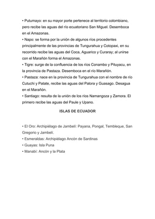 Este documento describe los principales ríos de Ecuador que desembocan en el Océano Pacífico y la cuenca del Amazonas, así como algunas islas notables. Los ríos del Pacífico incluyen el Chota, Esmeraldas, Guayas, Cañar, Jubones y Macará. Los ríos de la cuenca amazónica son el Putumayo, Napo, Tigre, Pastaza y Santiago. También menciona brevemente algunos archipiélagos e islas como Jambelí, Ancón de Sardinas, Isl
