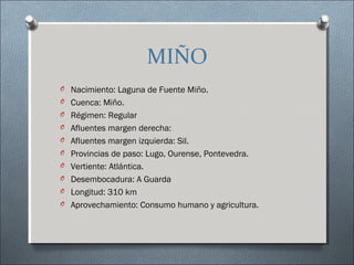 Este documento presenta información sobre 10 ríos españoles principales, incluyendo su nacimiento, cuenca, régimen, afluentes, provincias por las que pasa, vertiente, desembocadura, longitud y usos. Los ríos son: Miño, Duero, Tajo, Guadiana, Guadalquivir, Ebro, Júcar, Segura y Tormes.