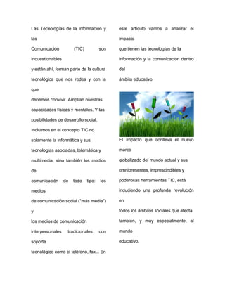 Este documento analiza los efectos de las tecnologías de la información y la comunicación (TIC) en el ámbito educativo. Explica que las TIC amplían las capacidades humanas y las posibilidades de desarrollo social. Si bien las TIC tienen un gran impacto en entornos como el hogar y las bibliotecas, su impacto aún no es tan significativo en las escuelas formales, donde su uso está más enfocado en lo instrumental que en los procesos de enseñanza y aprendizaje. Algunas universidades se esfuerzan por incorporar mejor