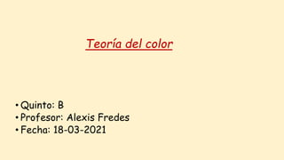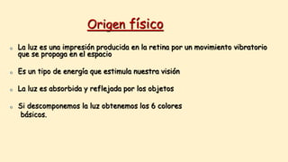 El documento presenta información sobre la teoría del color, incluyendo su origen físico como luz y su percepción a través de la retina. Explica los colores primarios, secundarios y terciarios, y conceptos como complementariedad, neutros y gamas cromáticas.