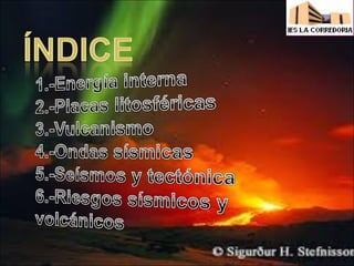 Este documento describe los procesos geológicos que causan cambios en la superficie terrestre, incluyendo la energía interna y externa, el movimiento de placas tectónicas, y los efectos de terremotos y volcanes. Explica que la litosfera está dividida en placas que se mueven colisionando entre sí, lo que causa terremotos y actividad volcánica, especialmente en los bordes convergentes y divergentes. También resume el ciclo de las rocas y los procesos de formación ígnea y met