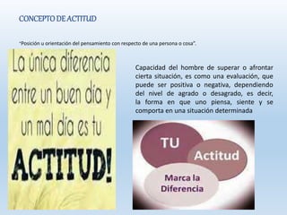 El documento contrasta las diferencias entre actitud y aptitud. Define la actitud como la disposición a actuar según creencias, mientras que la aptitud se refiere a la capacidad y habilidades innatas de una persona. Explica que la actitud depende más de la personalidad, mientras que la aptitud está relacionada con el intelecto y capacidades físicas. Además, distingue entre actitudes positivas como la aceptación y negativas como la culpa.