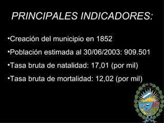 Este documento resume información demográfica y estadística sobre la ciudad de Rosario, Argentina. Detalla que Rosario fue fundada en 1852 y actualmente tiene una población de alrededor de 909,501 habitantes. Además, proporciona datos sobre la extensión del municipio, la distribución de distritos, y la cantidad de instituciones culturales, deportivas, de comunicación y centros de jubilados. Finalmente, resume los resultados electorales de 2007 a nivel provincial y nacional, donde el Frente Progresista Cívico y Social obtu