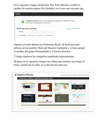 El documento proporciona instrucciones para crear páginas web en dos sitios diferentes: webs.com y webnode.com. Para crear una página en webs.com, los usuarios deben completar formularios con información como el título del sitio, categoría y tema deseado, y luego crear el sitio. Para crear una página en webnode.com, los usuarios deben registrarse completando un formulario con sus datos, seleccionar el tipo de sitio, agregar un título, eslogan e idioma, elegir una plantilla y crear la