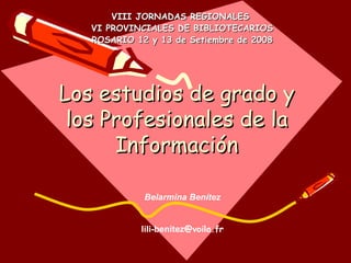El documento describe la evolución de la educación en bibliotecología en Argentina desde 1922 hasta la actualidad, cuando existen 11 carreras universitarias y 16 terciarias. También destaca la necesidad de ofrecer posgrados como maestrías y doctorados para asegurar la inserción en el contexto internacional y apoyar la educación, democracia y derechos humanos. Finalmente, lista varias universidades españolas que ofrecen maestrías y doctorados en bibliotecología y documentación.