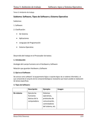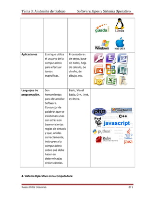 Este documento describe el software, los tipos de software y los sistemas operativos. Explica que el software incluye programas de sistema, aplicaciones y lenguajes de programación, y que los sistemas operativos ejecutan funciones básicas y administran los recursos de hardware. También proporciona ejemplos de sistemas operativos populares como Windows, Mac OS, Unix y Linux.