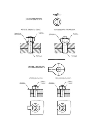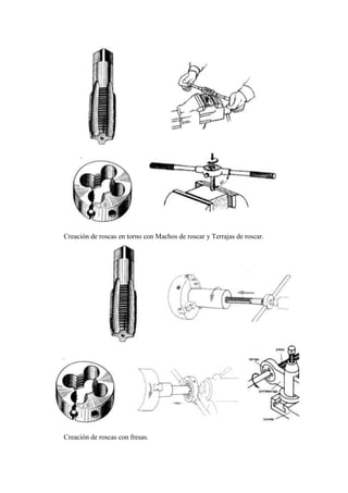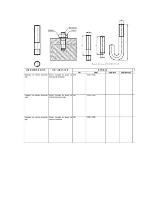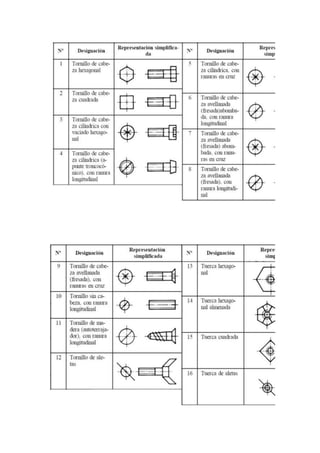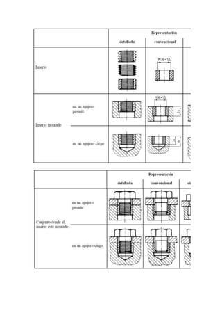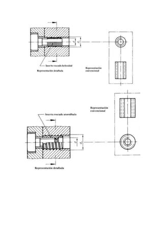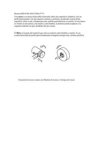 Una rosca es un hueco helicoidal creado en una superficie cilíndrica que permite unir dos piezas al girar una dentro de la otra. Una rosca está compuesta de un filete en forma de cordón triangular y puede ser externa u interior. Existen diferentes tipos de roscas normalizadas como la métrica, triangular o trapezoidal que se representan de forma simplificada en planos mediante líneas gruesas y finas.