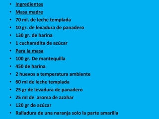 Este documento proporciona una receta para hacer roscón de reyes. Explica los ingredientes necesarios para la masa, incluyendo harina, huevos, leche, mantequilla y levadura. Describe el proceso de hacer la masa madre y amasar la masa principal hasta que doble su volumen. Luego se divide la masa en bolas, se les da forma de roscón y se dejan leudar de nuevo antes de hornear durante 18-20 minutos. Finalmente, se decoran los roscones con azúcar y huevo antes de servirlos con diferentes re
