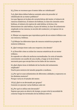 Este documento describe los componentes y funcionamiento de los motores polifásicos, en particular los motores trifásicos. Explica que un motor polifásico está diseñado para conectarse a redes de alimentación trifásicas o bifásicas y contiene tres arrollamientos estatóricos. También describe cómo se conectan las bobinas entre sí y los diferentes tipos de conexiones, como estrella y triángulo. Resalta que la velocidad de un motor trifásico depende del campo magnético giratorio creado por el bobin
