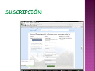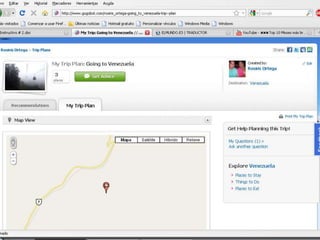 Este documento presenta varias plataformas y sitios web relacionados con viajes. Incluye herramientas para planificar y compartir experiencias de viaje, como Gogobot que facilita la planificación de viajes y Everlater para registrar y compartir recuerdos de viaje. También presenta recursos para explorar lugares como Historypin que recopila fotos antiguas y Street View de Google Maps, así como herramientas para encontrar alojamiento y planificar itinerarios como HouseTrip y RoadTripHelper.