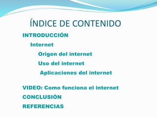 Este documento describe el origen e historia de Internet, así como sus usos y aplicaciones principales. Internet se originó en 1969 como una red entre universidades estadounidenses llamada Arpanet, y desde entonces ha crecido exponencialmente. Proporciona aplicaciones como la navegación web, correo electrónico, chat y redes sociales que permiten la comunicación y el acceso a la información de forma global. Internet se ha convertido en una importante herramienta de comunicación en todos los ámbitos de la vida.