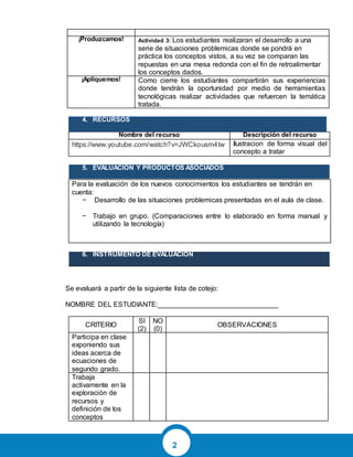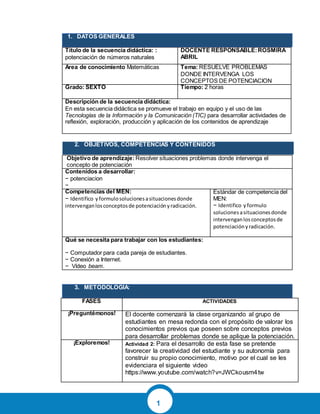 Este documento presenta una secuencia didáctica para el área de matemáticas en sexto grado. La secuencia se enfoca en resolver problemas que involucren el concepto de potenciación a través de actividades grupales con el uso de tecnología. Los objetivos son desarrollar el concepto de potenciación y resolver situaciones problema relacionadas. La metodología consta de cuatro fases: explorar conocimientos previos, ver un video explicativo, resolver problemas propuestos y aplicar los conceptos con herramientas tecnológicas. La evalu