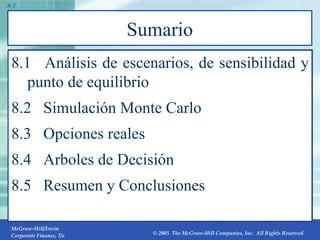 Este documento resume diferentes técnicas de análisis de riesgos y presupuesto de capital como el análisis de escenarios, sensibilidad, punto de equilibrio, simulación Monte Carlo y opciones reales. Explica cómo estas técnicas permiten evaluar proyectos de inversión considerando la incertidumbre en las variables clave y opciones futuras como expansión o abandono del proyecto.