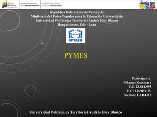 El documento es una presentación de la Universidad Politécnica Territorial Andrés Eloy Blanco en Barquisimeto, Venezuela. Menciona a la participante Rossmary Piñango y se centra en el tema de las PYMES, específicamente en mediana, pequeña y microempresa. Se correspondiente al curso electivo IV, sección LAD4310.