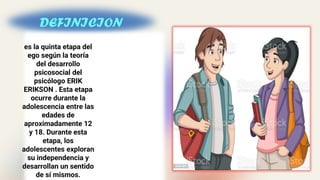 Este documento describe la quinta etapa del desarrollo psicosocial según Erik Erikson, la etapa de identidad versus confusión de identidad. Esta etapa ocurre durante la adolescencia cuando los jóvenes exploran su independencia y desarrollan un sentido de sí mismos. Completar con éxito esta etapa conduce a un fuerte sentido de la identidad. El documento también explica cómo los adolescentes experimentan con diferentes roles y actividades para establecer su identidad a través de la influencia de amigos, grupos y la cultura popular.