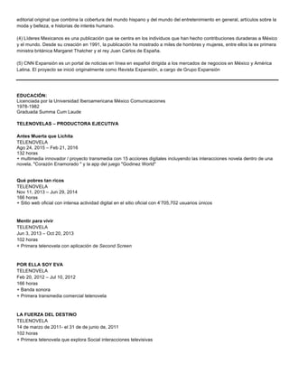 Rosy Ocampo es una productora mexicana galardonada con más de 30 años de experiencia creando contenido de televisión de clase mundial. Ella ha producido telenovelas exitosas que encabezan los ratings en México y Estados Unidos, así como programas educativos y de realidad. Ocampo también promueve la innovación en Televisa y ha desarrollado campañas sociales con organizaciones como UNICEF. Se le reconoce ampliamente como una pionera en la industria de la televisión.