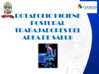 Este documento proporciona información sobre la higiene postural para trabajadores de la salud. Explica la anatomía y fisiología de la columna vertebral, las posibles alteraciones como la cifosis y escoliosis, y define la higiene postural. También describe los ángulos de confort, las zonas mínima y máxima, y los alcances funcionales de la columna vertebral.