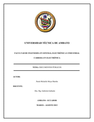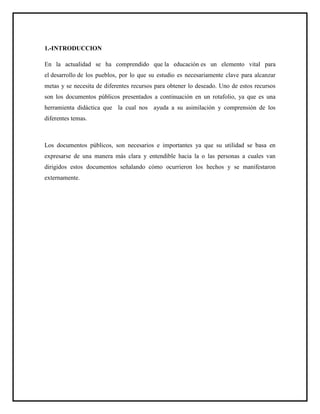 Este documento presenta diferentes tipos de documentos públicos como oficios, certificados, solicitudes, informes y circulares. Explica la estructura y función de cada tipo de documento, y proporciona ejemplos detallados de cada uno.