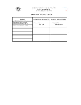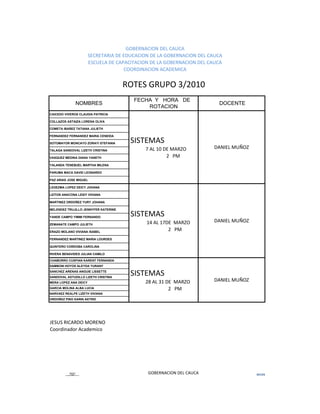 El documento presenta los horarios de rotación y nivelación para estudiantes de sistemas y enfermería de la Escuela de Capacitación de la Gobernación del Cauca. Se detallan los nombres de los estudiantes, las fechas y horas en que realizarán sus prácticas con los docentes Daniel Muñoz y Henry Morales.