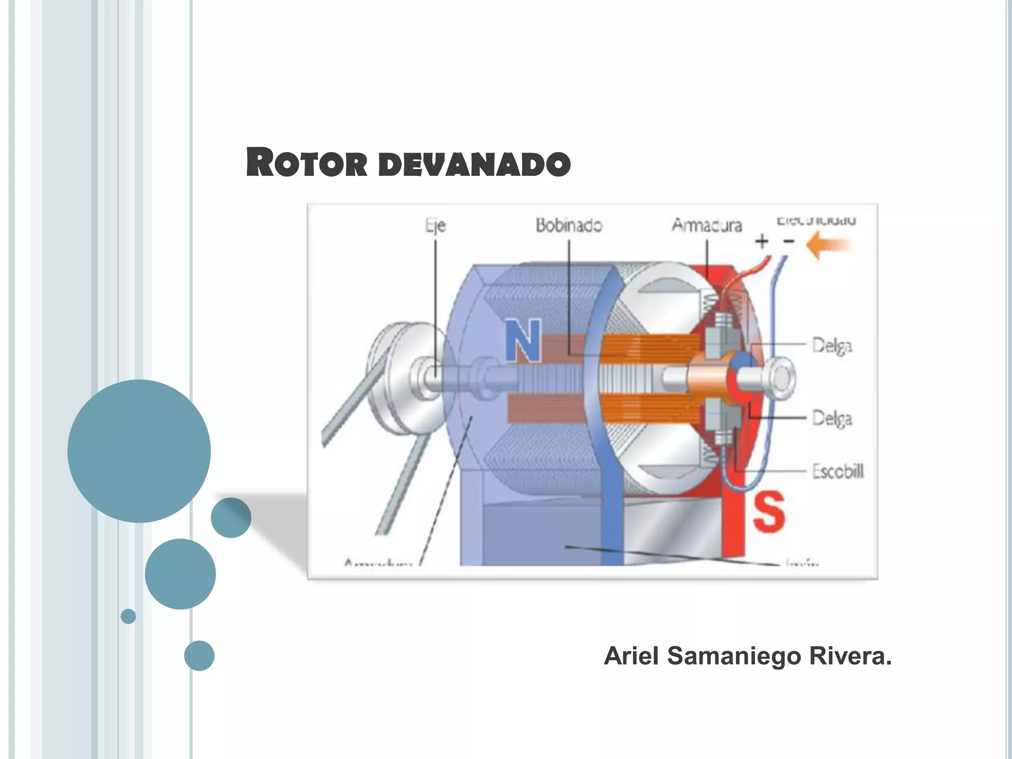 El documento describe el rotor devanado de un motor de inducción, el cual lleva bobinas conectadas a anillos deslizantes en el eje que se conectan a resistencias variables para poner el rotor en cortocircuito al igual que la jaula de ardilla. El campo magnético giratorio del estator induce corriente en el rotor secundario, cuya corriente y campo magnético inducido causan la rotación del motor. El documento también lista los componentes principales de un motor de inducción simple y ofrece algunas observaciones sobre los motores de rotor devanado.