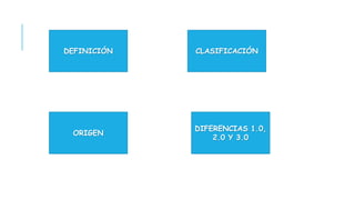 Este documento define la Web 2.0 como un conjunto de aplicaciones y herramientas que permiten compartir información y colaborar entre usuarios, facilitando que los usuarios pasen de ser meros consumidores a productores de contenido. Explica que la Web 2.0 surgió como resultado de cambios culturales donde los usuarios pueden expresarse e intercambiar ideas en la web. También clasifica las herramientas de la Web 2.0 según su uso y describe las diferencias entre la Web 1.0, 2.0 y 3.0, señalando que la 2.