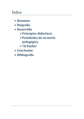 El documento resume las principales ideas del filósofo Jean-Jacques Rousseau sobre la educación. Rousseau creía que la educación debía centrarse en el niño y su desarrollo natural, no en los adultos. Propuso que la enseñanza debe ser intuitiva y práctica para cada edad del niño. Expuso estas ideas en su novela "El Emilio", dividida en etapas desde la infancia hasta el matrimonio.