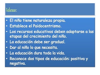 El documento habla sobre Jean-Jacques Rousseau, un escritor, filósofo y músico suizo nacido en 1792 que formó parte de la Ilustración y anticipó el Romanticismo. El documento también describe las teorías educativas de Rousseau, incluyendo que los niños no deben ser educados con razonamientos que no pueden comprender y que el proceso educativo debe partir del entendimiento de la naturaleza del niño y sus intereses.