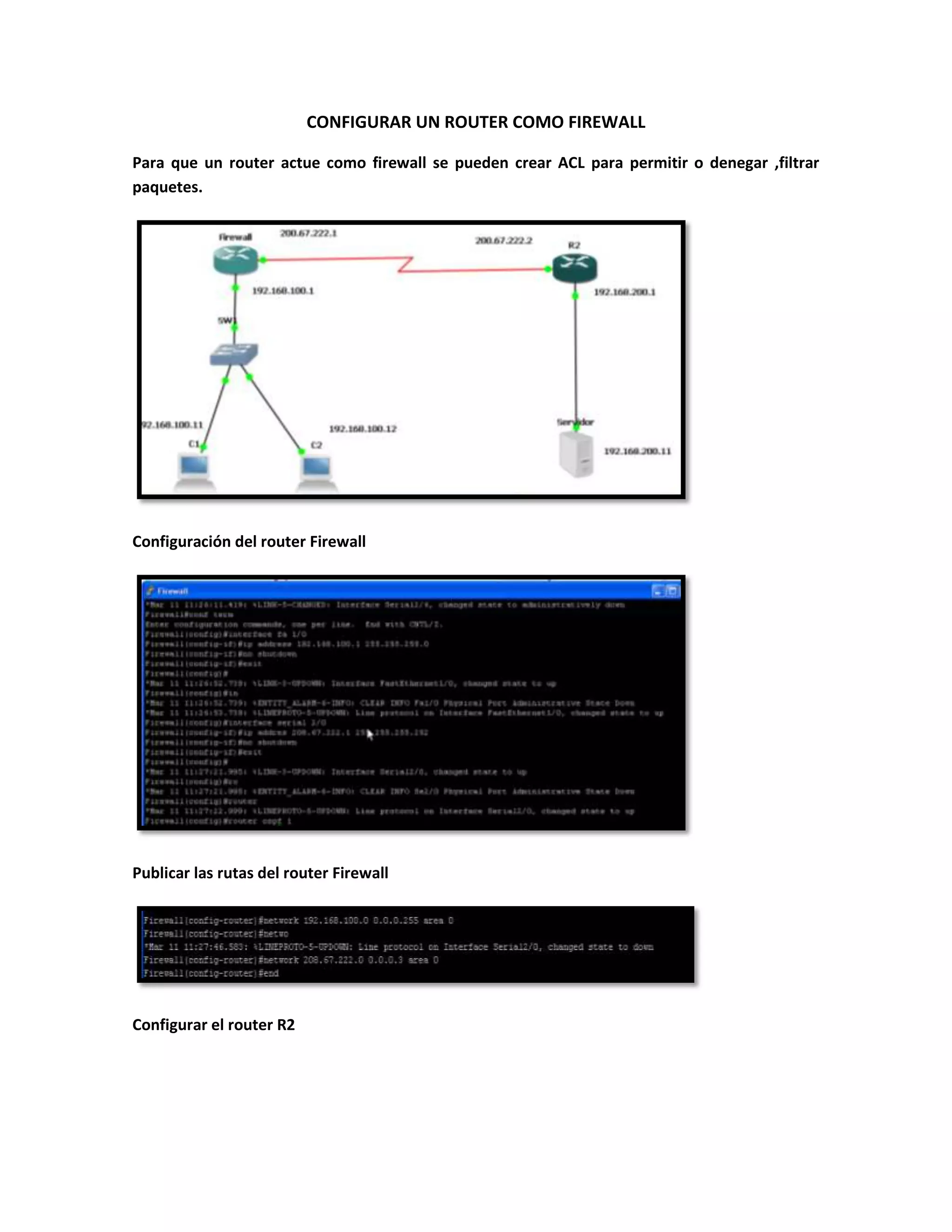 Configurar un router como firewall implica crear listas de control de acceso (ACL) para filtrar paquetes y permitir o denegar acceso, configurar direcciones IP y rutas, y comprobar la conectividad. Las ACL se aplican a interfaces para permitir que solo ciertos equipos realicen ping o accedan de forma remota al router o a un servidor web.