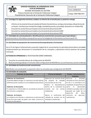 Este documento presenta una guía de aprendizaje sobre routers. Explica que un router es un dispositivo de red que conecta redes diferentes al nivel de red del modelo OSI. Describe las actividades de aprendizaje que incluyen investigar términos como protocolos de enrutamiento y características de routers, y realizar prácticas guiadas de configuración de routers. También presenta los recursos, evaluaciones y referencias bibliográficas para el aprendizaje sobre routers.