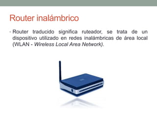 El documento describe los routers inalámbricos, dispositivos esenciales para las redes locales inalámbricas (WLAN), destacando sus características y componentes como antenas, puertos RJ45 y RJ11. También se explican los diferentes estándares Wi-Fi (802.11a, b, g, n) junto con sus velocidades y frecuencias. Finalmente, se enumeran las ventajas y desventajas de los routers inalámbricos, incluyendo su movilidad y limitaciones de seguridad y velocidad.