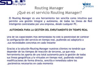El documento describe el servicio Routing Manager, una herramienta que permite la gestión autónoma de líneas de telefonía en tiempo real desde cualquier ordenador. Ofrece características como personalizar mensajes de voz, establecer horarios de atención, enrutar llamadas a múltiples destinos, y gestionar el encaminamiento de llamadas entrantes según prefijos telefónicos.