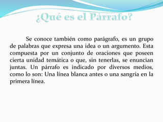 Este documento describe los diferentes tipos de párrafos, incluyendo narrativos, descriptivos, argumentativos, expositivos y relativos. También explica los tres tipos principales de párrafos por su estructura: ordinario, moderno y en forma de sumario.