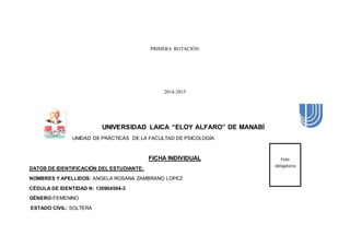 Este documento presenta la ficha individual de una estudiante de psicología llamada Angela Rosana Zambrano López que realiza su seminternado en una institución. Incluye información sobre sus datos personales, la universidad, facultad, coordinador y supervisora a cargo. También presenta el caso de una estudiante de 14 años llamada M.R. que es derivada a la institución por problemas de conducta y se describe su situación familiar compleja así como las sesiones realizadas para abordar su problemática.