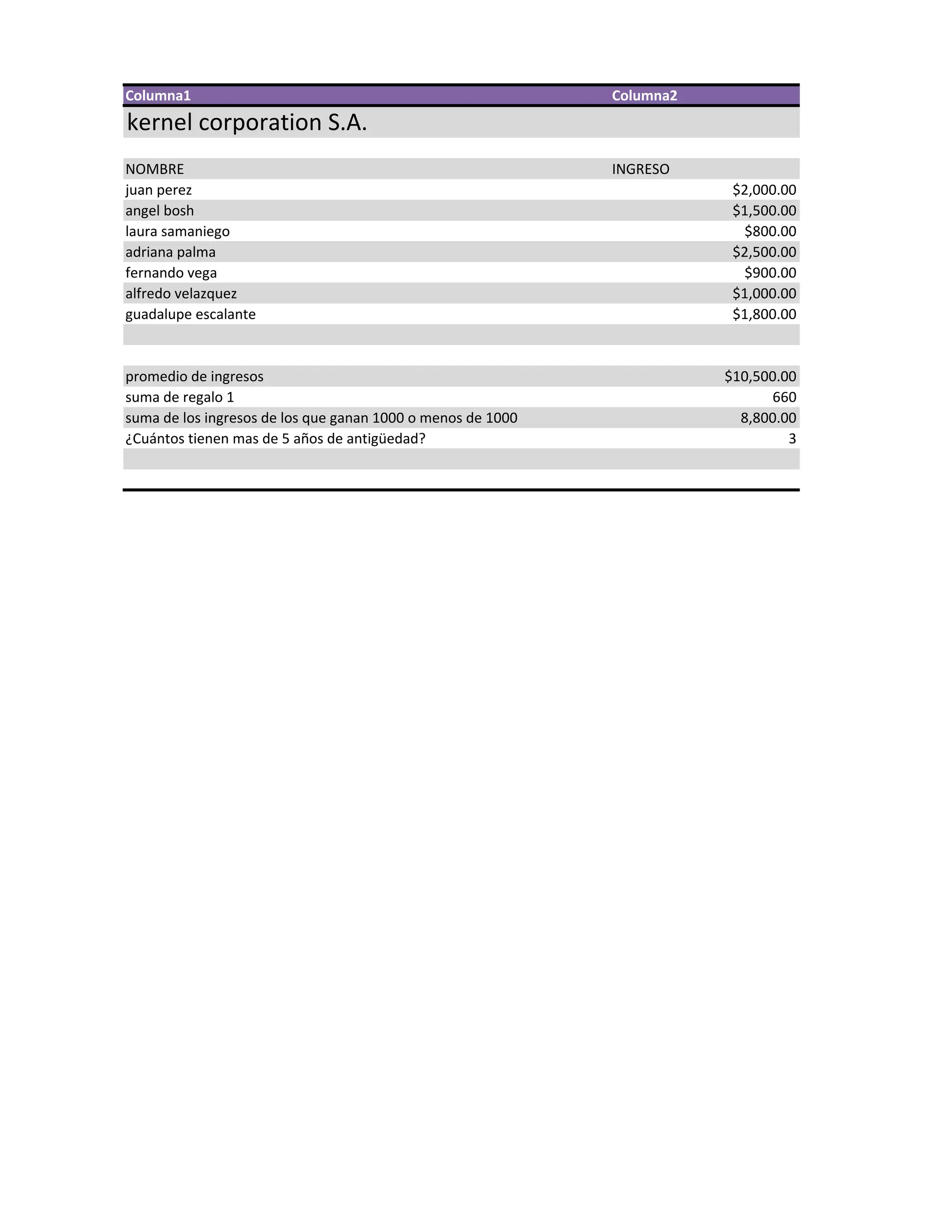 El documento presenta información sobre los ingresos y antigüedad del personal de Kernel corporation S.A. Incluye tablas con el nombre, ingreso, antigüedad y regalos del personal. Se calculan el promedio de ingresos, la suma de ingresos de quienes ganan $1000 o menos y la cantidad de personas con más de 5 años de antigüedad.