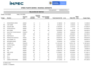 Este documento presenta una relación de ventas de productos entre el 1 y 31 de enero de 2022 para la región noroeste de Puerto Berrio. Incluye el código, nombre y presentación de cada producto, junto con la cantidad vendida, venta total sin IVA, ganancia e IVA para cada uno. Al final resume los totales de cantidad facturada, venta total, y ganancia para todo el periodo.