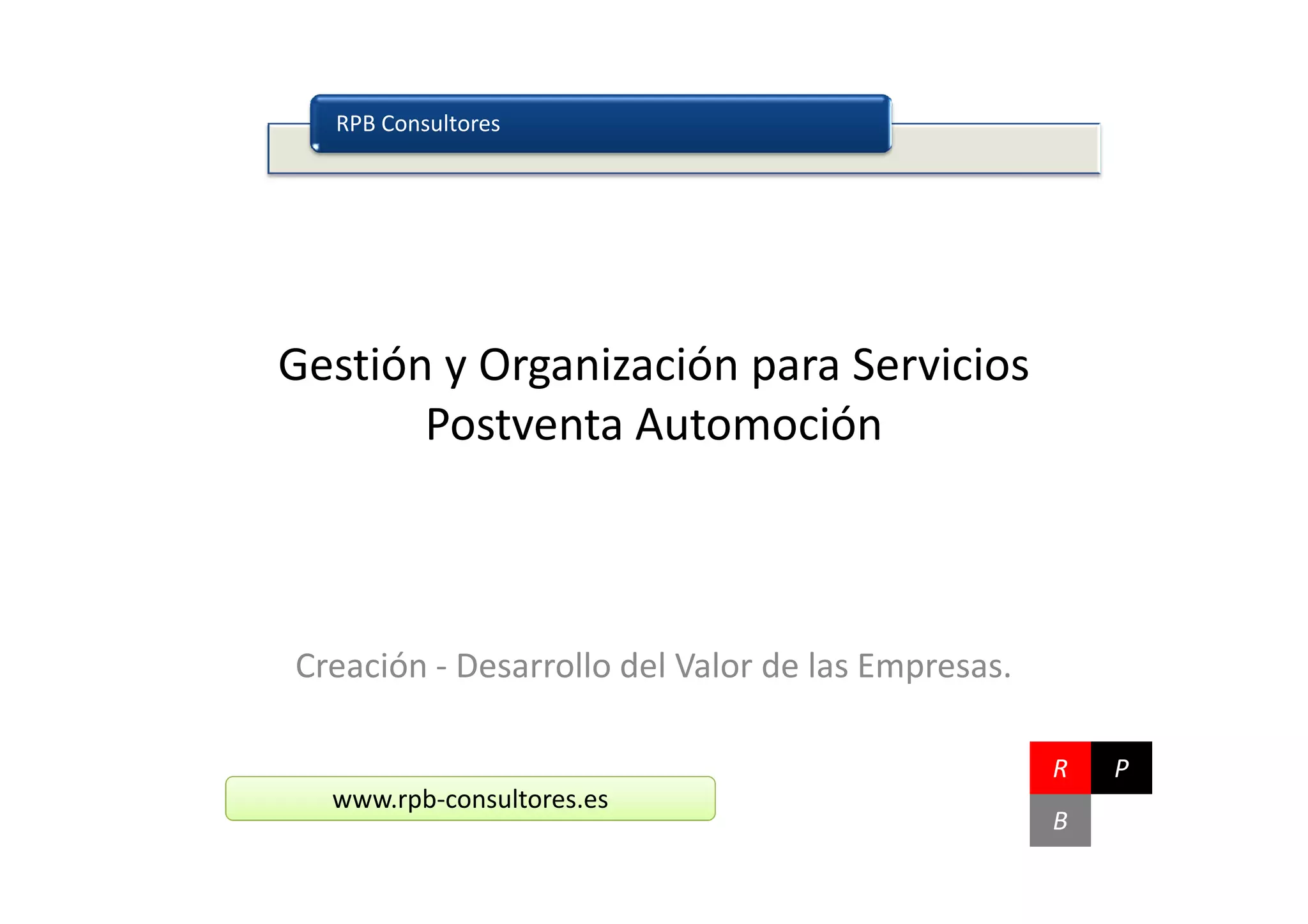 RPB Consultores ofrece servicios de consultoría, formación y productos para mejorar la gestión y organización de los servicios postventa del sector automovilístico. Trabajan con talleres para aumentar su rentabilidad a través del diseño de procesos, procedimientos, presupuestos y auditorías. Ofrecen también programas de formación y productos de software para controlar ratios y finanzas. Su objetivo es añadir valor a las organizaciones de servicios postventa del automóvil.