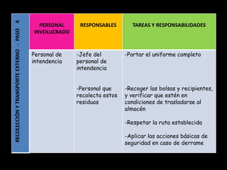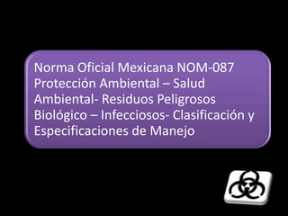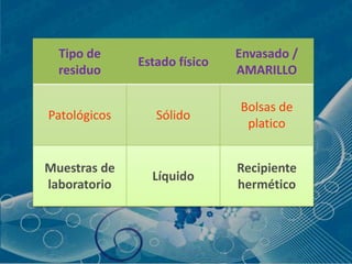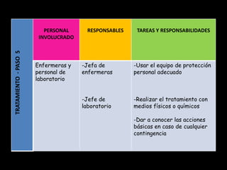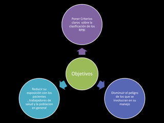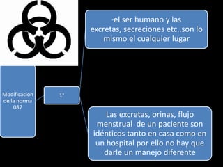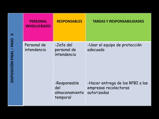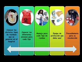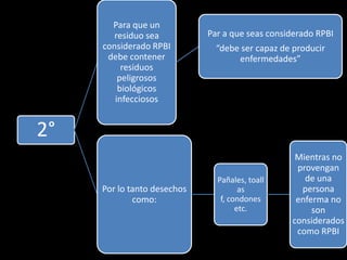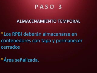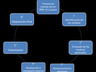 Este documento presenta las normas para el manejo de residuos peligrosos biológico-infecciosos (RPBI) en 5 pasos: 1) Identificación y envasado según estado y tipo. 2) Almacenamiento temporal en contenedores cerrados. 3) Recolección 1-2 veces al día cuando estén llenos en un 80%. 4) Tratamiento preferiblemente con autoclave para desinfección. 5) Disposición final de los residuos tratados. También incluye consideraciones especiales para objetos punzocortantes.