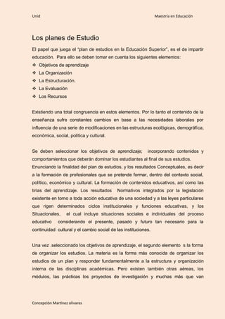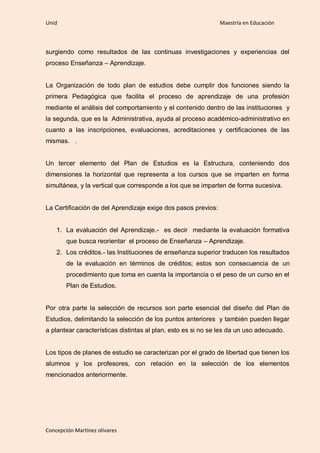 El documento describe los elementos clave de un plan de estudios en educación superior. Explica que un plan de estudios debe incluir objetivos de aprendizaje, organización, estructura, evaluación y recursos. También debe considerar factores como necesidades laborales y cambios sociales. Un plan de estudios organiza los cursos y contiene una dimensión horizontal de cursos simultáneos y una dimensión vertical de cursos sucesivos. La evaluación y los créditos son pasos para certificar el aprendizaje de acuerdo a un plan de estudios.
